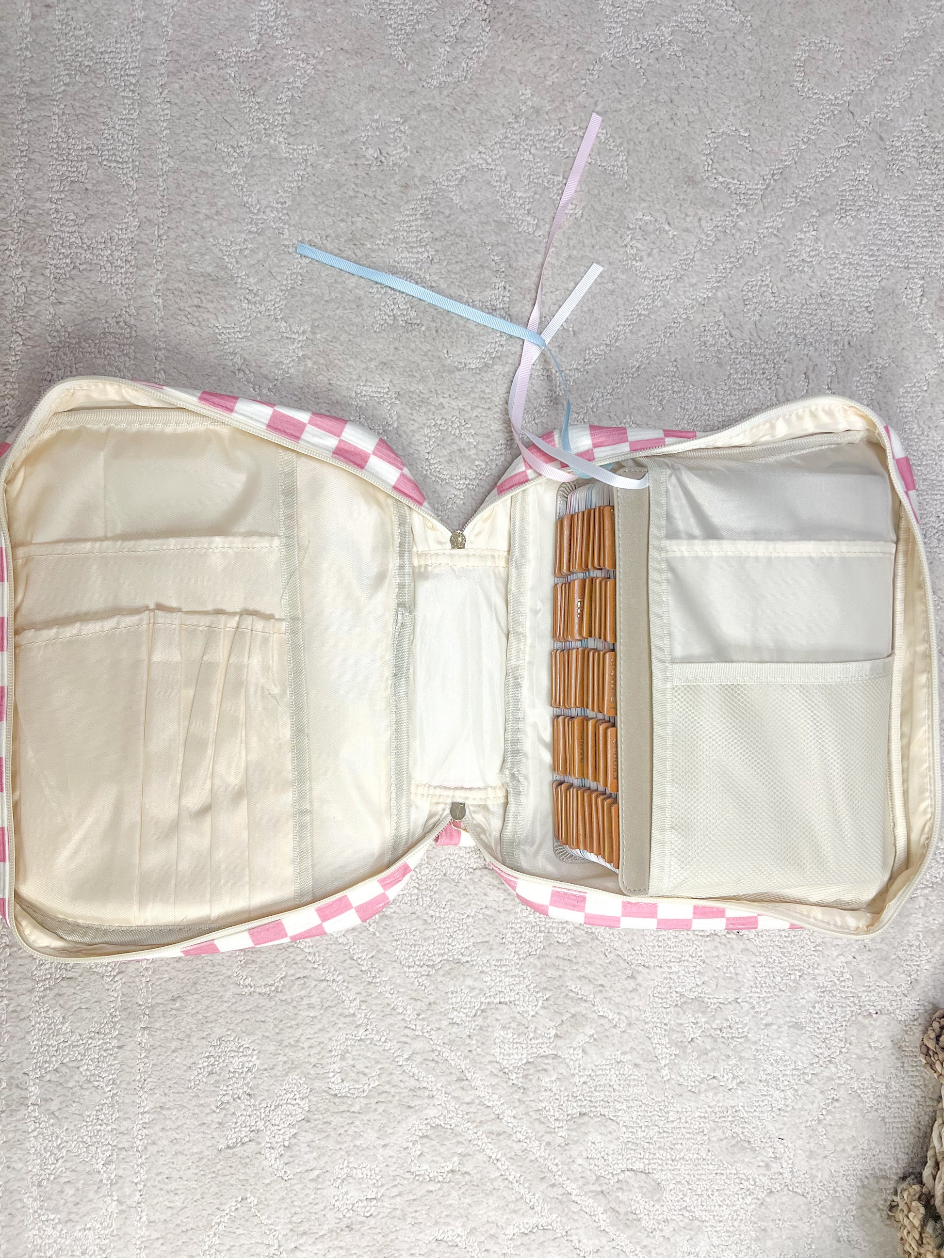 Featuring a soft fabric with a pink and white checkered pattern. Full zipper closure to keep your Bible secure, with a front pocket zipper perfect for Bible cards, pens, Bible notes, or sticky pads. Has a matching fabric handle perfect for carrying. Makes a PERFECT gift, for yourself or someone you love!