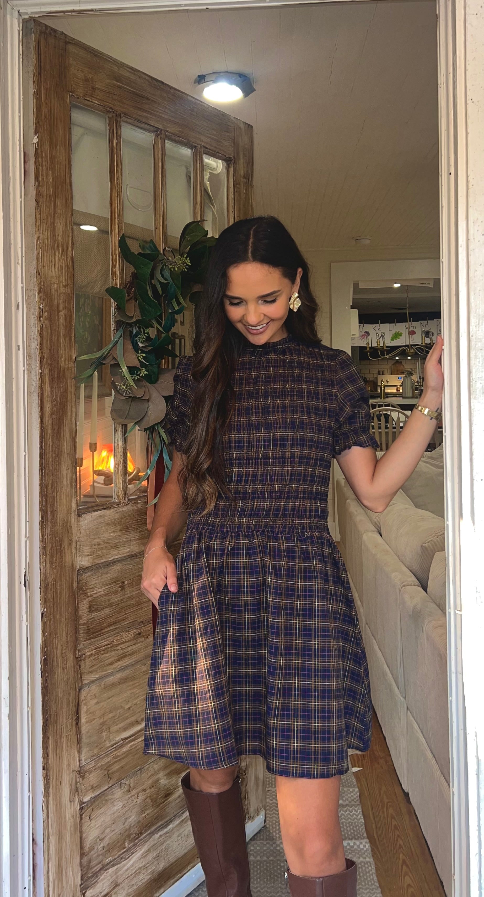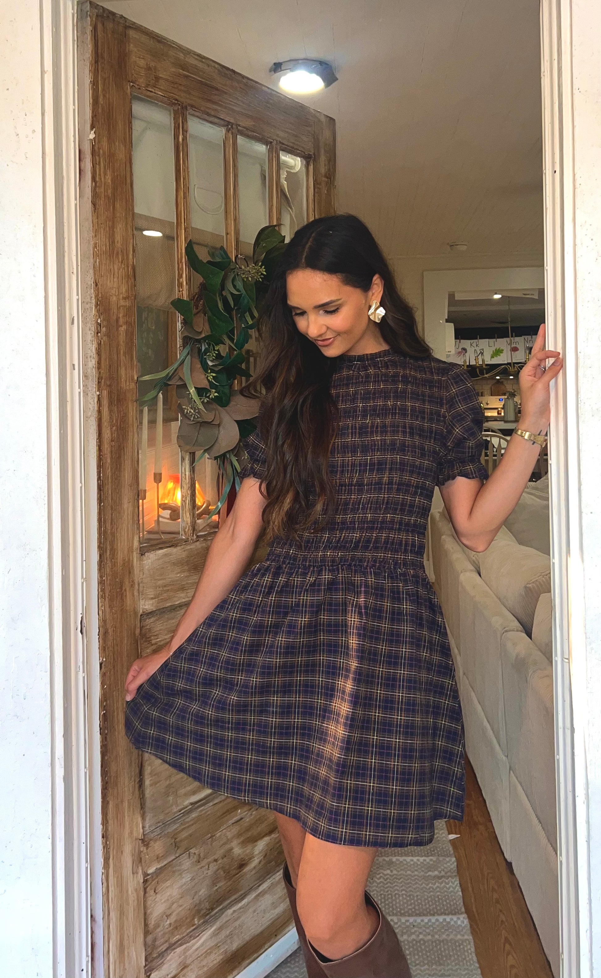 Ruffle Mock Neck Short Sleeve Smocked Mini Dress